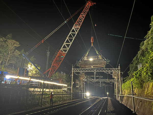 750tクローラクレーンを使用したこ線橋撤去 ・RC主桁をワイヤーソー切断により3分割し、750tクローラクレーンで撤去 ・柱2組は、ワイヤーソーで切断し、750tクローラクレーンで撤去 |