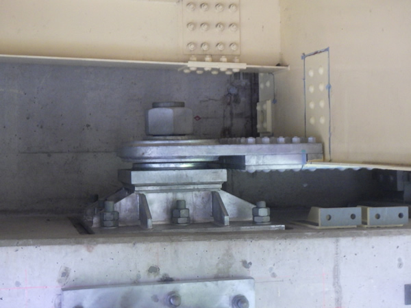工種:水平力分担構造工・制振構造工・支承取替工・RC巻立工 ①.水平力分担構造は、ユニック・高所作業車を使用して施工。 ②.制振構造工は、吊上げ時の吊り代がなかったため、吊り用治具を製作して吊り代を確保し、高所作業車・ユニックを使用して施工 ③.支承取替工(上り:2基、下り:2基)は、500tジャッキ4基(上り線)・300tジャッキ4基(下り線)を使用して施工 ④.オープン掘削&足場で橋脚をRC巻立て工に補強工 |